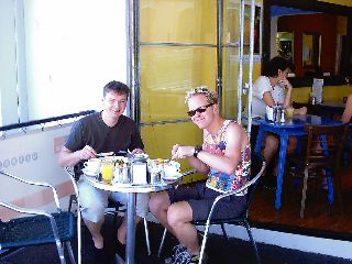 Om 10.00 uur ging de wekker en konden we beginnen met inpakken. Wat een mens al niet met zich mee kan sjouwen zeg, de koffers konden net dicht. Laatste keer ontbeten in ons favoriete eettentje in Crown street en daarna een beetje weemoedig afscheid genomen van het personeel van Park Lodge Hotel. De taxi bracht ons in nog geen kwartiertje naar de luchthaven, en ook het inchecken bij Virgin Blue (een soort easyjet) ging vrij snel. Godzijdank waren ze soepel met onze loodzware baggage, we hoefden niets bij te betalen. We waren ruim op tijd dus mooi even tijd om wat te typen buiten. Het was echter bewolkt en koud (!) dus zijn we maar snel binnen gaan zitten.